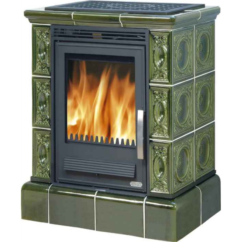 ABX Helvetia K kachľová pec na drevo s kombi vložkou (liatina / plech), kachľový sokel, zelenáKachľová pec klasického dizajnu s liatinovým čelom a dvierkami.