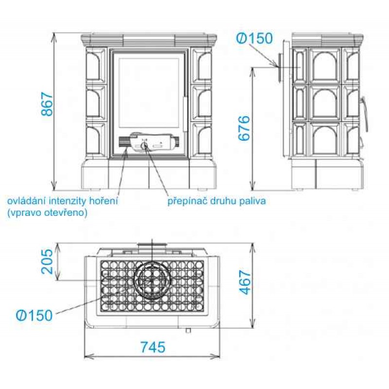 Vzdialenosť osi horného dymovodu (mm): 205