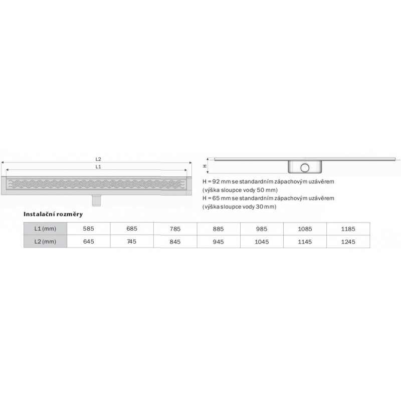 - Inštalačná výška: 92 mm (pre sifón 50 mm) alebo 65mm (pre sifón 30 mm)