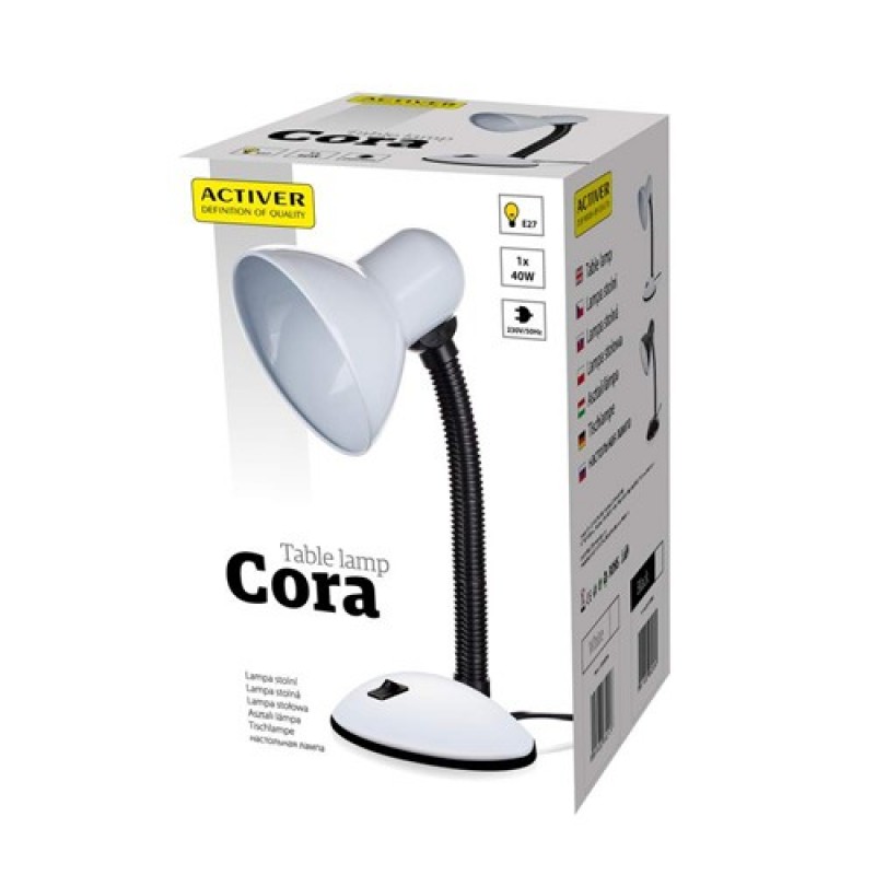 Stolná lampa CORA je vhodná pre doplnkové osvetlenie v detských izbách, pracovniach a kanceláriách. Lampa má ohybný krk, čím ju možno nastaviť do mnohých uhlov svietenia. Lampa má vlastný vypínač umiestnený na podstavci. Lampa je určená pre žiarovky so závitom E27, biela farba. Žiarovka nie je súčasťou balenia.Výška (cm): 34