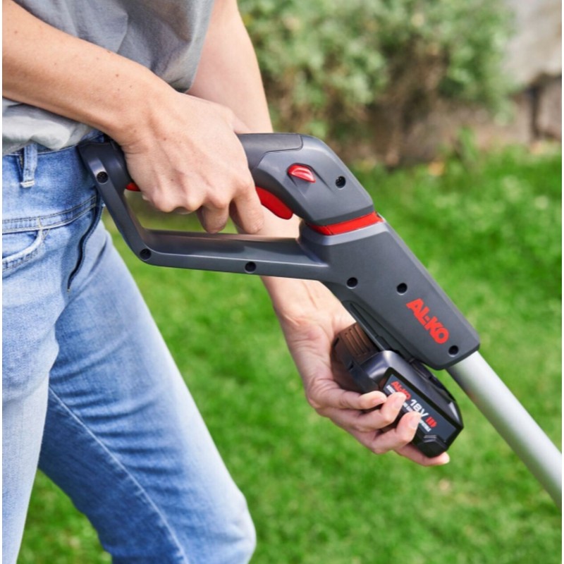 Vďaka bezkefovému motoru je dosiahnutý vyšší výkon a dlhšia doba kosenia. Výšku kosenia je možné nastaviť 3x v rozmedzí 30, 40 a 50 mm a pri priamej jazde je možné ovládaciu páku ľahko pevne zaaretovať. Akonáhle je kosenie kosačkou AL-KO 22.4 Li (šírka záberu 22 cm), ktoré je rovnako jednoduché ako vysávanie, ukončené, môžete kosačku zavesiť, aby ste ušetrili miesto vďaka otvoru integrovanému v rukoväti. Táto ľahká kosačka je poháňaná 18V Li-ion akumulátorom radu BOSCH COMPATIBLE FOR HOME AND GARDEN AL-KO. K dispozícii sú akumulátory 2,5/4/5 a 6 Ah.