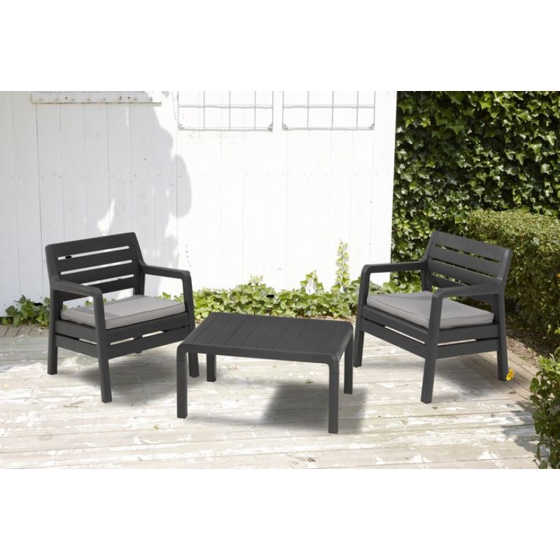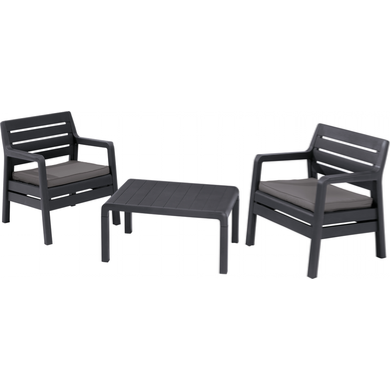 ALLIBERT DELANO Balcony záhradný set, grafit / šedá 17201164DELANO je balkónový nábytok v prevedení imitácie dreva. Nábytok sa perfektne hodí do záhrady, terasy aj do interiéru. Moderný dizajn a vysoká kvalita sú charakteristickými znakmi tejto sady. Súprava sa skladá z dvoch kresiel s poduškami a stola. Ideálne pre rannú kávu pre dvoch.