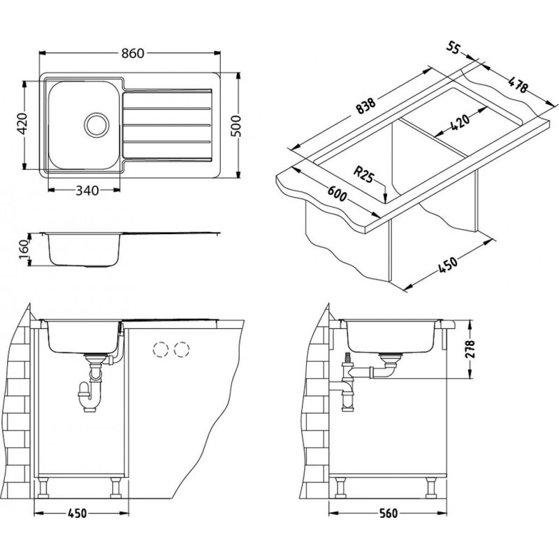 Vstavané drezy Alveus: sú inštalované do pracovnej dosky a vďaka tomuto vytvárajú plynulú pracovnú plochu. Drez je zasunutý do dostatočne veľkého výrezu zhora a upevnený dodanými úchytkami. Vstavané drezy sú vhodné pre pracovné dosky, ktoré majú hrúbku 25 až 40 mm.