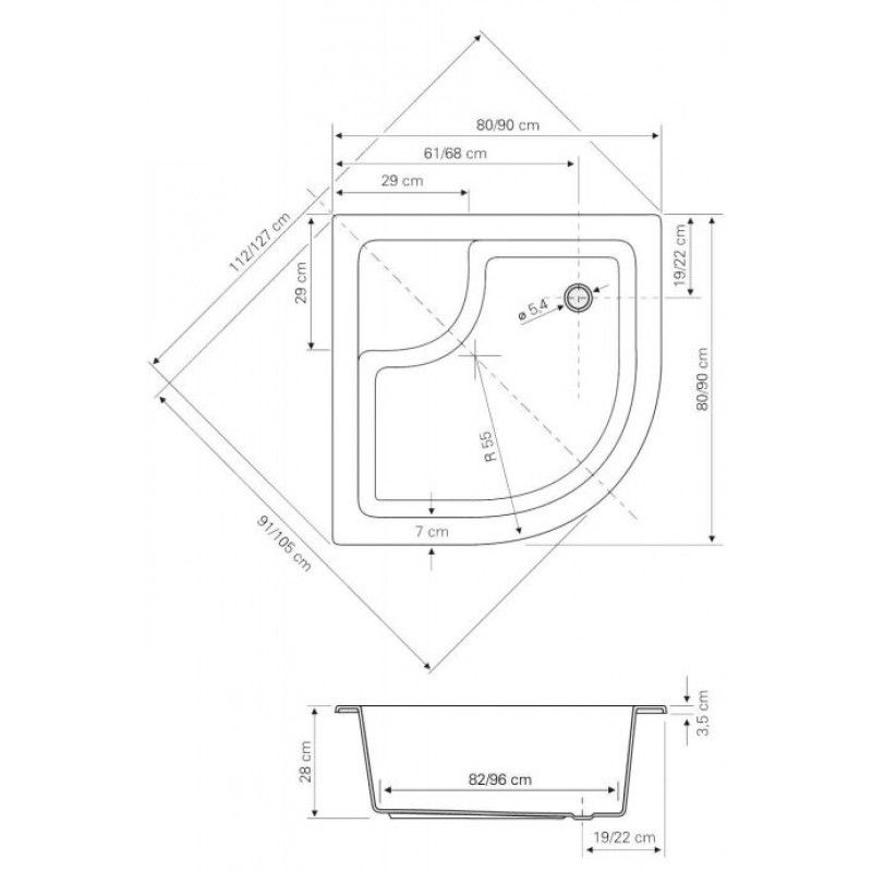 AQUALINE 90 Štvrťkruhová vanička hlboká, akrylát C93Sprchová vanička akrylová