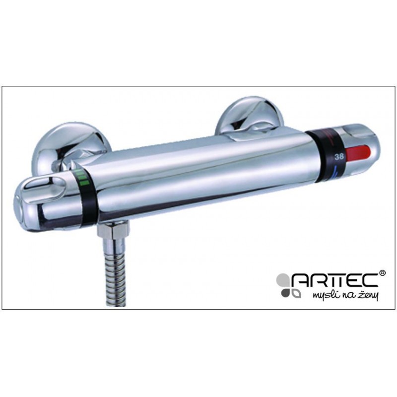 ARTTEC Thermo TM 17 Batéria termostatická sprchová nástenná BAT00210Nástenná sprchová vodovodná batéria TM 17 zo série termostatických vodovodných batérií je veľmi praktická najmä pre rodiny s deťmi, pretože nastavenie teploty zamedzí prípadnému obareniu horúcou vodou. Krytka termostatu obsahuje bezpečnostnú klapku, ktorá zamedzí obyčajnému nastavenie teploty vody na viac ako 38 ° C. Druhou krytkou možno nastaviť sila toku vody. Batéria obsahuje veľmi kvalitné termostatické kartuše. Materiál pre výrobu thermo batérií je mosadz s chrómovým pozinkovaním.