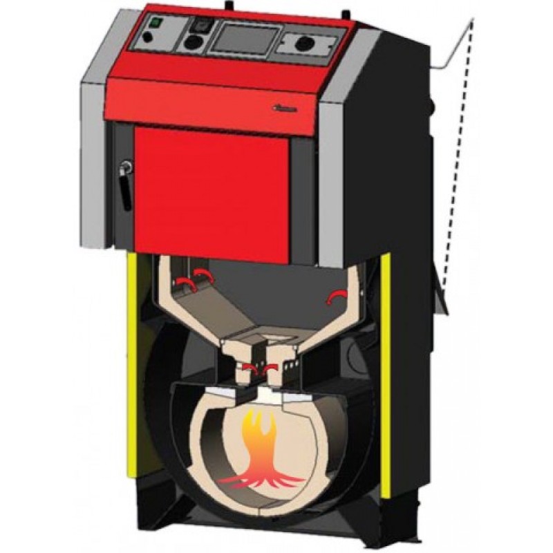 Teleso kotlov je vyrobené ako zvarenec z oceľových plechov 3-8 mm . Tvorí ich násypka paliva , ktorá je v spodnej časti opatrená žiaruvzdornou tvarovkou s pozdĺžnym otvorom pre priechod spalín a plynov . Dohořívací priestor pod ňou je vybavený keramickými tvarovkami . V zadnej časti tela kotlov je zvislý spalinový kanál , opatrený vo vrchnej časti zatápacou záklopkou . Vrchná časť spalinového kanála je vybavená odťahovým hrdlom pre pripojenie na komín .