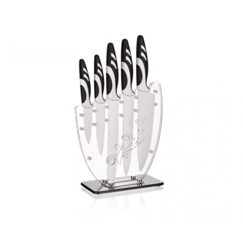 Materiál: čepeľ - nerez 3Cr14, držadlo - plast (guma), stojan plast (akryl)