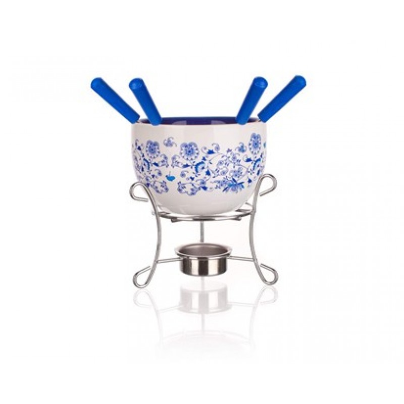 BANQUET 6 dielny fondue set na čokoládu ONION 17AA12116 dielny fondue set na čokoládu Onion. Set obshuje: 1x keramická miska (priemer 11,5 cm, výška 7,5 cm), 1x stojanček s držiakom pre čajovú sviečku (výška 8cm), 4x vidlička (dĺžka 15cm), materiál nerez + PP.