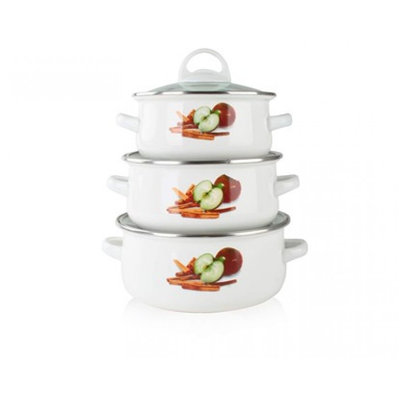 BANQUET 6dielna sada smaltovaného riadu Apple 1306SMAP03-A6dielna sada smaltovaného riadu Apple obsahuje dekorované hrnce so sklenenými pokrievkami o priemeroch 16,18,20 cm s objemami 0,9 l, 1,3L, 1,9l. Hrúbka materiálu je 0,6mm.
