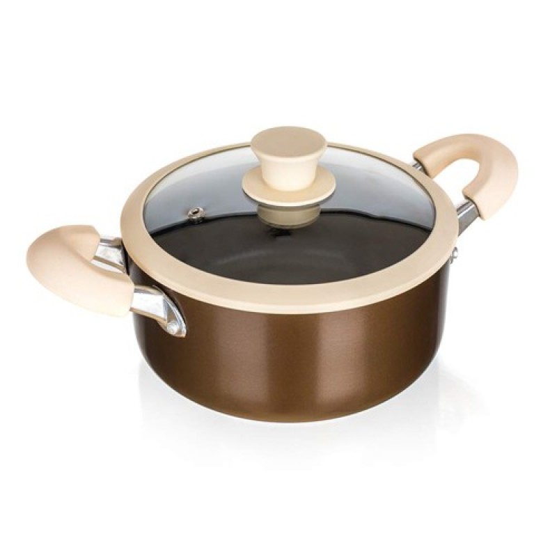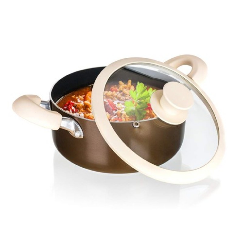 Hliníkový hrniec CONTRA 20 x 9 cm s nepriľnavým 2-vrstvovým čiernym povrchom, s bielymi silikónovými úchytmi a sklenenou pokrievkou s bielym silikónovým knobom a silikónovým okrajom, objem 2,8 L. Hrniec je vhodný pre indukčné varenie.Výška (cm): 9