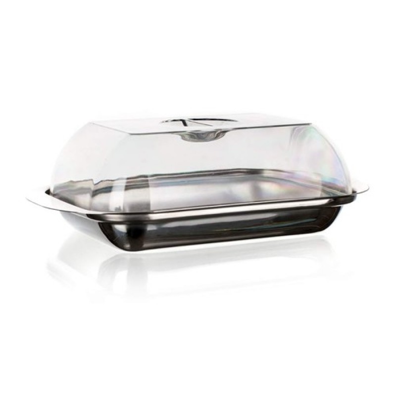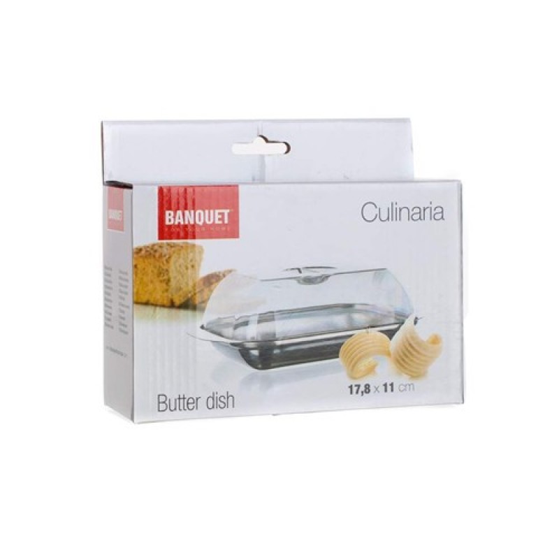 Dóza na maslo Culinaria,rozmery dózy: dĺžka 17,8 cm, šírka 11 cm, výška 5,5 cm, materiál - nerez 430 (18/0, sila 0,50 mm), plastové transparentné viečko.