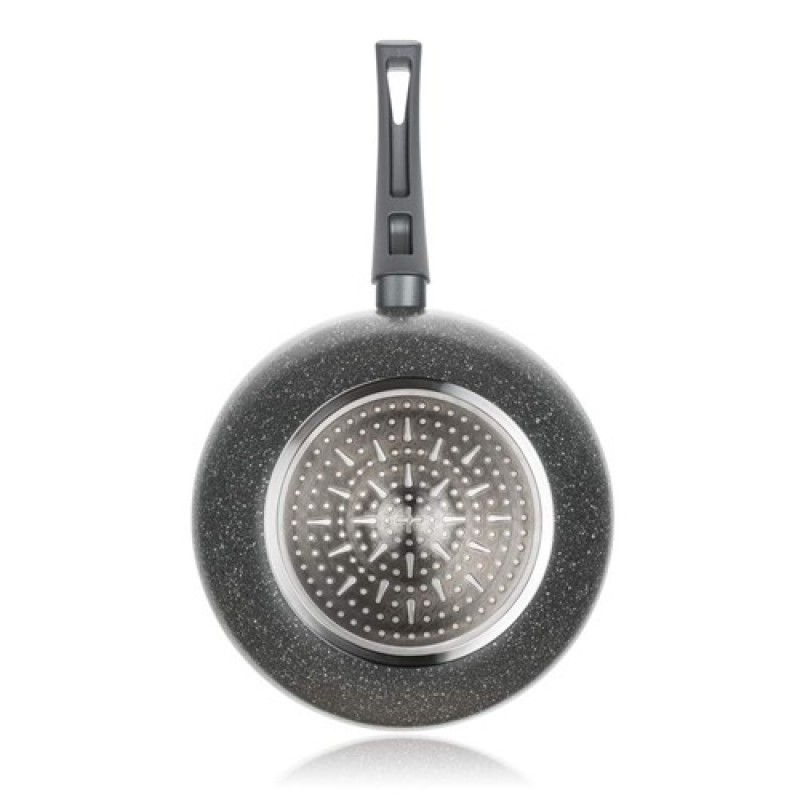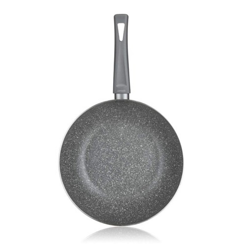 Hliníková lisovaná panvica WOK GRANITE 28 x 8 cm s nepriľnavým 2-vrstvovým povrchom v granitovom dekore, šedú bakelitovou rukoväťou so soft-touchovou povrchovou úpravou a plne indukčným dnom.Výška (cm): 8