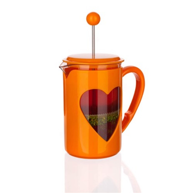 BANQUET Kanvica na kávu Darby 800ml oranžová 49B040OSklenená kanvica na kávu a čaj 800ml Darby v plastovom dekoračným obale oranžovej farby s ozdobným výrezom v tvare srdca. Vnútri je kanvica vybavená filtračným piestom z nerez ocele, ktorého stlačením je dosiahnuté dokonalého oddelenia kávovej usadeniny alebo čaju od výsledného nápoja. Odolné sklo určené pre horúce nápoje. Nie je určené na priame vykurovanie na platničke.