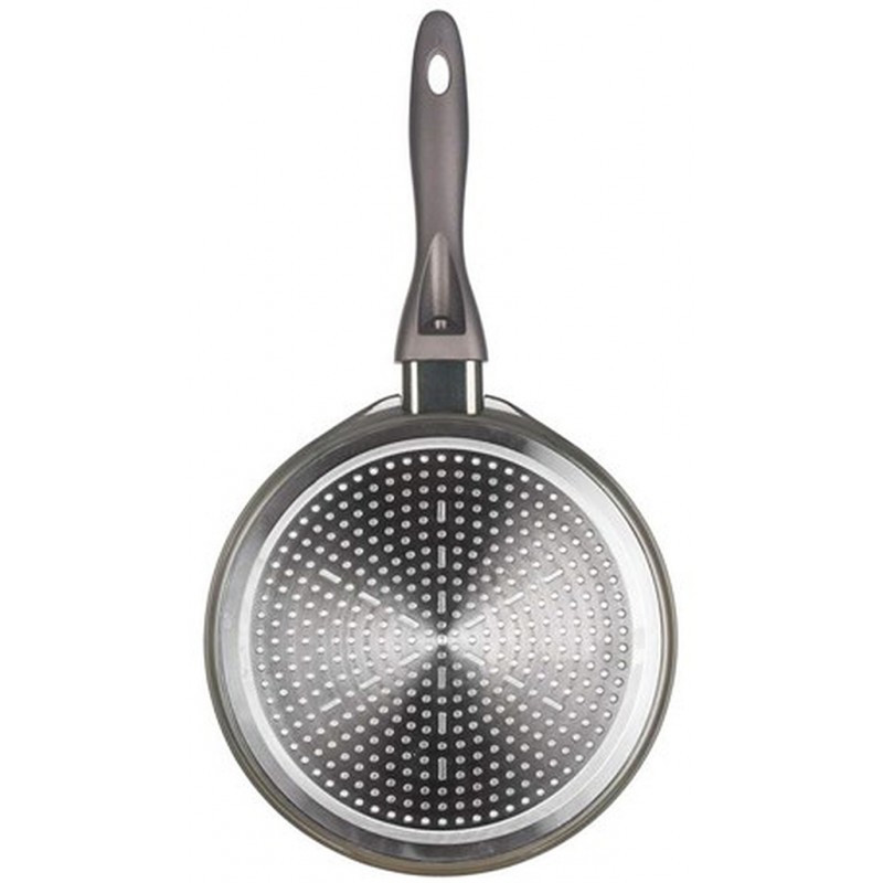 Hliníková liata kovaná panvica na palacinky METALLIC PLATINUM s nepriľnavým povrchom, 24x1,6 cm, vonkajší karbón metalický nástrek, hrúbka steny 3 mm, plne indukčné dno, soft-touch rukoväť. Nepriľnavý povrch je veľmi tvrdý a odolný proti poškriabaniu. Panva je odolná proti nárazu a deformácii tvaru. Vysoká tepelná vodivosť zaisťuje rýchle a ekonomické varenie - dlho drží teplotu.Technické parametre produktu: