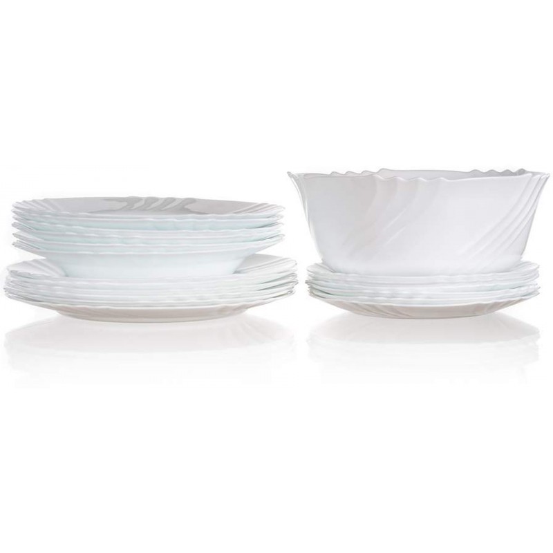 19-dielna sklenená sada EBRO obsahuje: 6 x dezertný tanier o priemere 20 cm, 6 x plytký tanier o priemere 25,5 cm, 6 x hlboký tanier o priemere 23,5 cm a 1 x misa s priemerom 23 cm. Všetko je odolné voči tepelnému šoku, vhodné do umývačky a mikrovlnnej rúry.parametre: