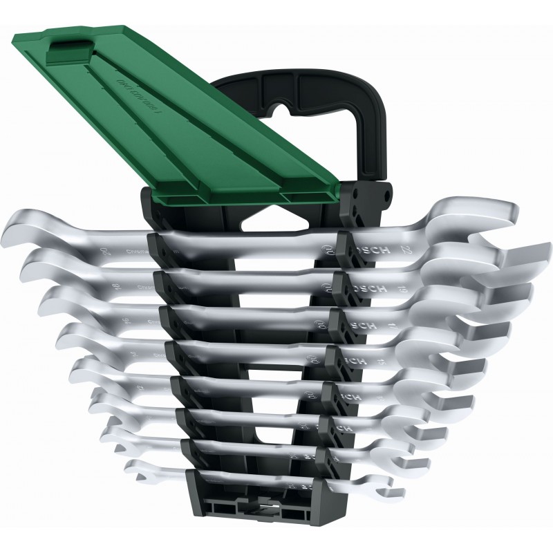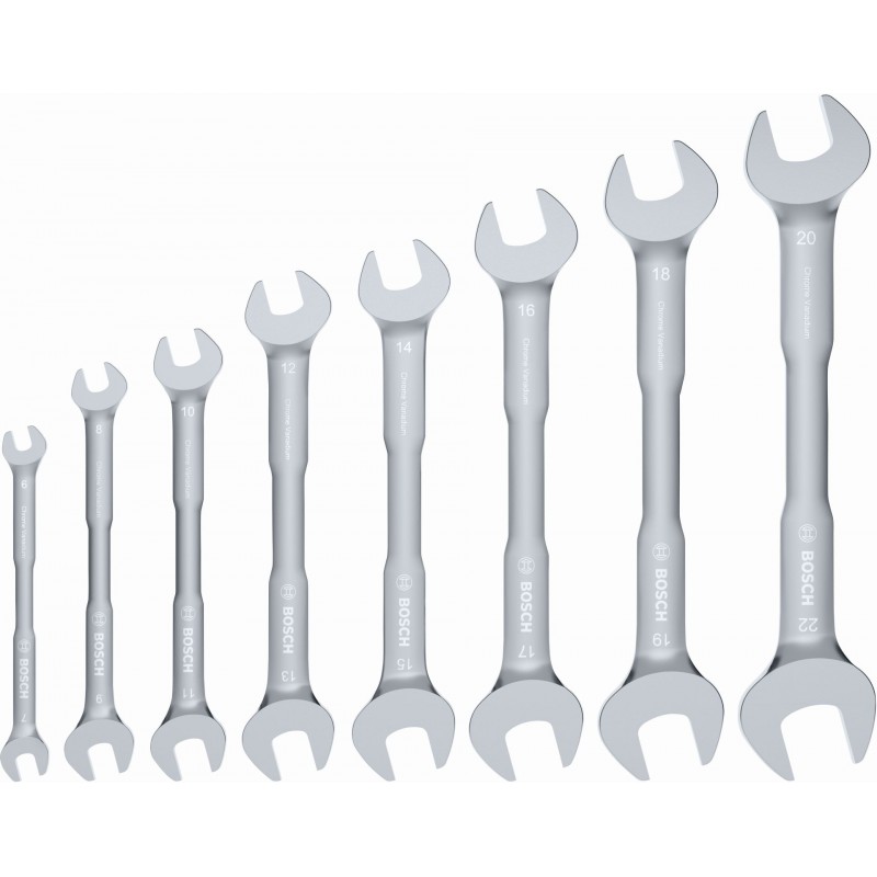 8-dielna súprava obojstranných vidlicových kľúčov Bosch je dokonalým spoločníkom na rôzne opravy a údržbu v domácnosti. Vďaka dvom rôznym veľkostiam vidlíc kľúča v rozsahu od 6 do 22 mm (6/7, 8/9, 10/11, 12/13, 14/15, 16/17, 18/19, 20/22 mm) je možné ľahšie utiahnuť a povoliť matice a skrutky rôznych rozmerov. Tieto kľúče sú vyrobené z odolnej vysokokvalitnej chróm-vanádiovej ocele a majú matný pochrómovaný povrch pre vyššiu odolnosť proti korózii. Poskytnú spoľahlivú funkčnosť v náročných podmienkach a umožnia uťahovací moment, ktorý je minimálne o 20 % vyšší ako vyžaduje norma ISO 1711-1. Ergonomicky navrhnuté rukoväti pomôžu znížiť únavu rúk a zlepšia manipuláciu s náradím. Pre vyšší komfort sa obojstranné vidlicové kľúče dodávajú v praktickom organizéri na jednoduchú prepravu a skladovanie. Súprava zodpovedá normám ISO 10102 a ISO 1711-1.