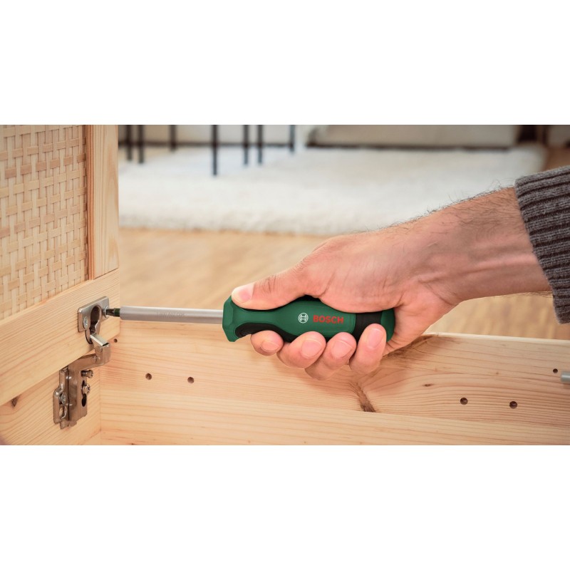 Zvládni všetky upevňovacie práce rýchlo a efektívne pomocou vysokokvalitného bitového skrutkovača Bosch. Poskytne komfortný a praktický spôsob rýchleho a efektívneho vykonávania opráv a zvládnutia rôznych ďalších domácich prác. Tento bitový skrutkovač má kompaktnú a ergonomickú dvojzložkovú rukoväť s mäkkými uchopovacími plochami, ktoré zaistia optimálny komfort a používanie. Bity zostávajú pevne na svojom mieste vďaka silnému magnetickému držiaku bitov v odolnom drieku na dosiahnutie vysokého uťahovacieho momentu až 21 Nm. Šesťhranná predná časť rukoväti zabráni zakotúľaniu.