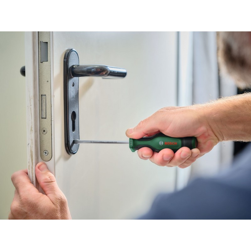 Zvládni akékoľvek upevňovacie práce rýchlo a efektívne s vysokokvalitným skrutkovačom Bosch – vyrobeným s ohľadom na špičkový výkon a vynikajúci komfort. Skrutkovač je vybavený pochrómovaným driekom z extra tvrdej ocele S2, ktorý zaistí mocný uťahovací moment: minimálne o 40 % prekračujúci požiadavky normy (ISO 2380). Robustný hrot skrutkovača je s ohľadom na stabilné skrutkovanie magnetický a lepší vizuálny kontrast zaistí čierne fosfátovanie. Dvojzložková rukoväť má mäkkú uchopovaciu plochu na lepšiu manipuláciu a vyšší komfort. Vďaka šesťhrannej prednej časti rukoväti nedochádza k zakotúľaniu. Ktorý skrutkovač Bosch na danú prácu? Výber je jednoduchý a rýchly vďaka farebne rozlíšeným označeniam veľkosti a typu.