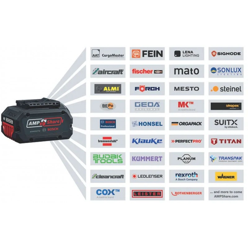 Kompatibilné s Profesionálnym 18 V systémom Bosch a alianciou výrobcov akumulátorov AMPShare.