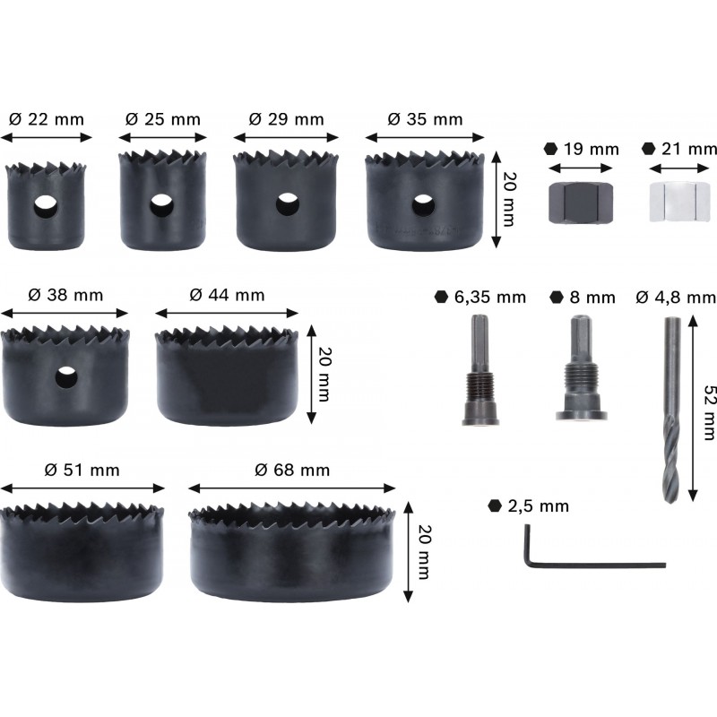 Sada nástrčných dieroviek do dreva a sadrokartónu so strediacim vrtákom 22; 25; 29; 35; 38; 44; 51; 68 x 15 mm