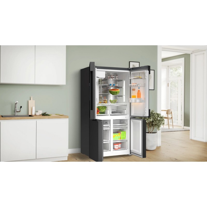 Ak hľadáte americkú chladničku 90 cm s veľkým objemom, praktickým dávkovačom vody a ľadu a bezstarostnou prevádzkou bez odmrazovania, Bosch Serie 6 je skvelá voľba. Kombinuje prémiový dizajn, praktické funkcie na každodenné používanie a technológie, ktoré pomáhajú udržať potraviny dlhšie čerstvé.