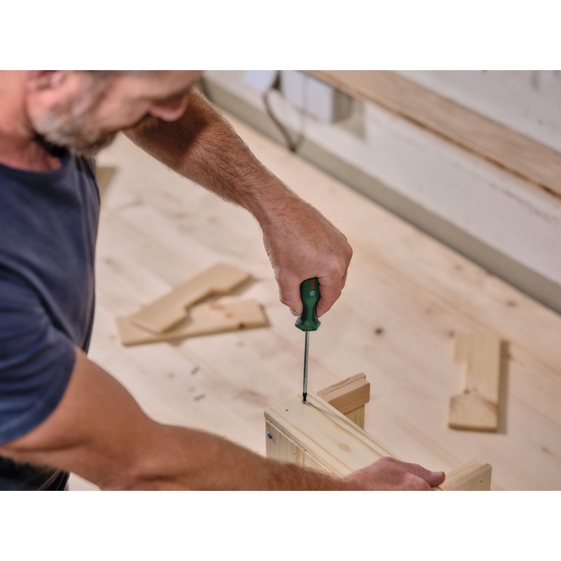 Zvládni akékoľvek upevňovacie práce rýchlo a efektívne s vysokokvalitným skrutkovačom Bosch – vyrobeným s ohľadom na špičkový výkon a vynikajúci komfort. Skrutkovač je vybavený pochrómovaným driekom z extra tvrdej ocele S2, ktorý zaistí mocný uťahovací moment: minimálne o 40 % prekračujúci požiadavky normy (TMD-705). Robustný hrot skrutkovača je s ohľadom na stabilné skrutkovanie magnetický a lepší vizuálny kontrast zaistí čierne fosfátovanie. Dvojzložková rukoväť má mäkkú uchopovaciu plochu na lepšiu manipuláciu a vyšší komfort. Vďaka šesťhrannej prednej časti rukoväti nedochádza k zakotúľaniu. Ktorý skrutkovač Bosch na danú prácu? Výber je jednoduchý a rýchly vďaka farebne rozlíšeným označeniam veľkosti a typu.