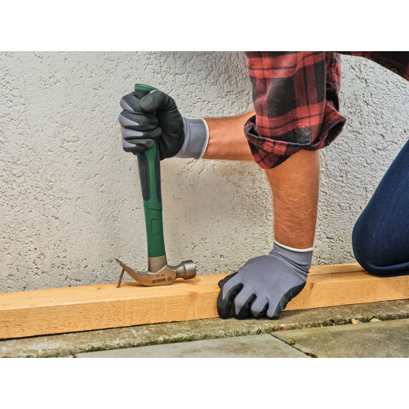 Pridajte si tesárske kladivo Bosch 450 g (16 oz) do súpravy dielenského náradia na silné a všestranné používanie v kategórii DIY. Toto univerzálne náradie je vynikajúcim spoločníkom pri zatĺkaní alebo vyťahovaní klincov pri rozoberaní drevených konštrukcií. Toto kladivo je vyrobené z tvrdej uhlíkovej ocele (50-58 HRC) a zosilnené sklolaminátovým jadrom a poskytuje silnú a presnú úderovú silu s minimom vibrácií. Matovaná úprava hlavy zvyšuje ochranu proti hrdzi a podporuje dlhú životnosť. Na ľahké vyberanie uviaznutých klincov je vybavené zahnutým špicom s drážkou tvaru V. Každú prácu zvládnete komfortne a s prehľadom vďaka ergonomickej rukoväti s dynamickým dizajnom mäkkého úchopu a vyváženej hlave.