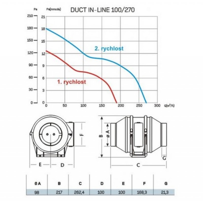 CATA DUCT IN-LINE 100/270 potrubný ventilátor radiálne 00702000Potrubný ventilátor radiálne, priemer. 100 mm, 270 m3 / h, 22 dB (A), 23 mmH2O (225 Pa), IPX4.