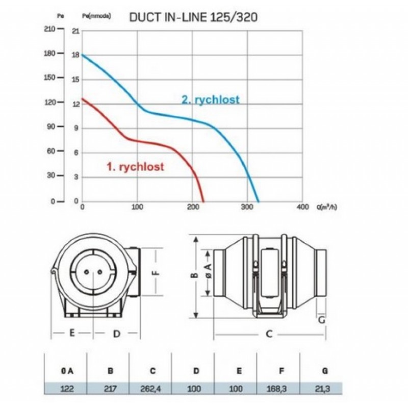 CATA DUCT IN-LINE 125/320 potrubný ventilátor radiálne 00703000Potrubný ventilátor radiálne, priemer. 125 mm, 320 m3 / h, 25 dB (A), 23 mmH2O (225 Pa), IPX4.