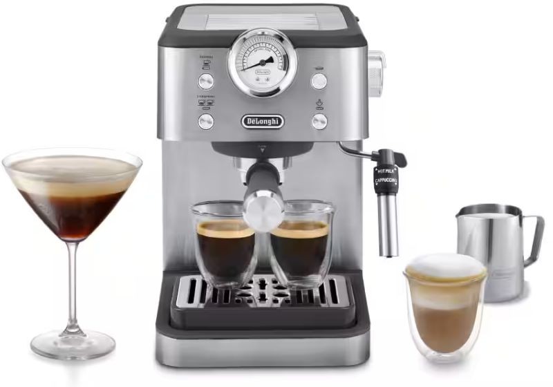 De'Longhi EM450.M je štýlový pákový kávovar, ktorý spája elegantný taliansky dizajn, jednoduché ovládanie a výkon pre každodennú prípravu výbornej kávy doma. Ak hľadáte kávovar na espresso, s ktorým si pripravíte intenzívne espresso, jemné lungo aj nadýchané cappuccino, tento model vás zaujme svojou praktickosťou aj vzhľadom. Vďaka 15-barovému tlaku a systému Thermoblock dosiahnete rýchle nahriatie a stabilnú teplotu, čo je kľúčové pre správnu extrakciu a plnú chuť každej šálky.