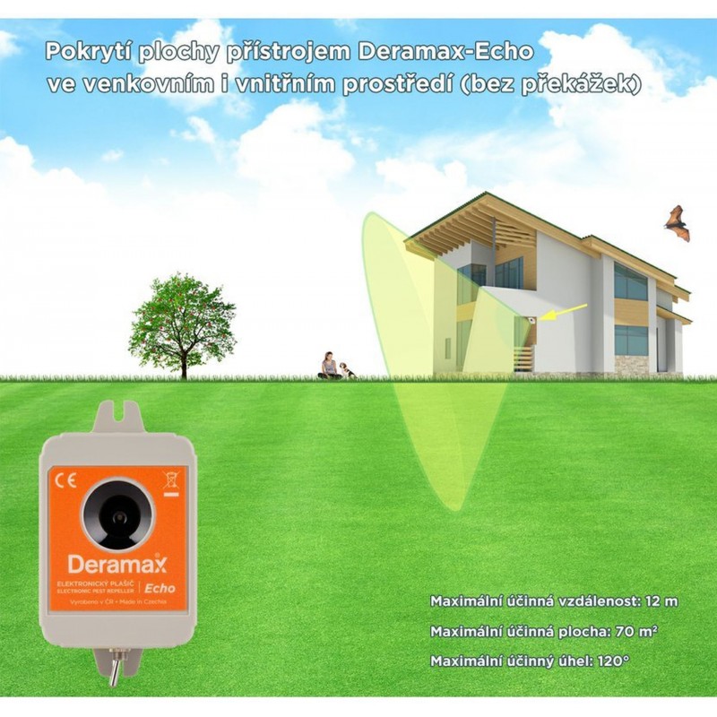 Odpudzovač Deramax-Echo slúži na ochranu vnútorných i vonkajších priestorov pred netopiermi. Prístroj je pre človeka úplne bezpečný a bezhlučný. Škodcovia sú trvalo obťažovaní ultrazvukovými signálmi plašiča a v krátkom čase chránený priestor opúšťa. Prevádzka prístroja je ekologická bez využitia chemických prostriedkov.