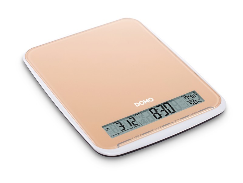 DOMO Kuchynská váha do 10 kg - oranžová, sklenená DO9106WKuchynská sklenená váha s presnosťou na 1g , vážiaca až do 10 kg. S viac funkciami ako je časovka, hodiny, dátum, teplota, vlhkomer ..