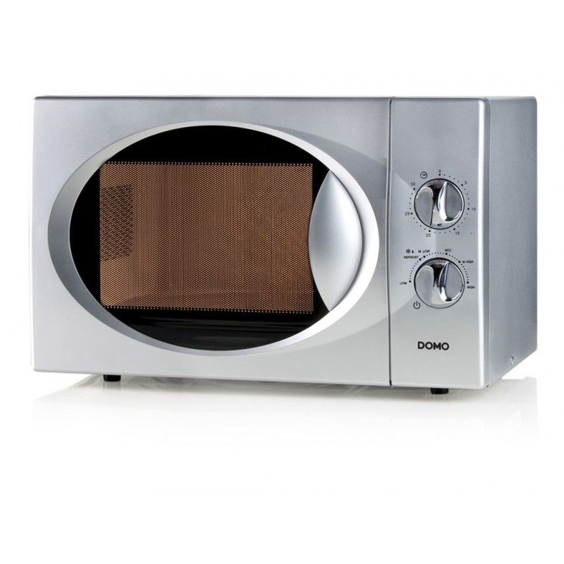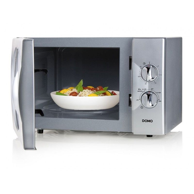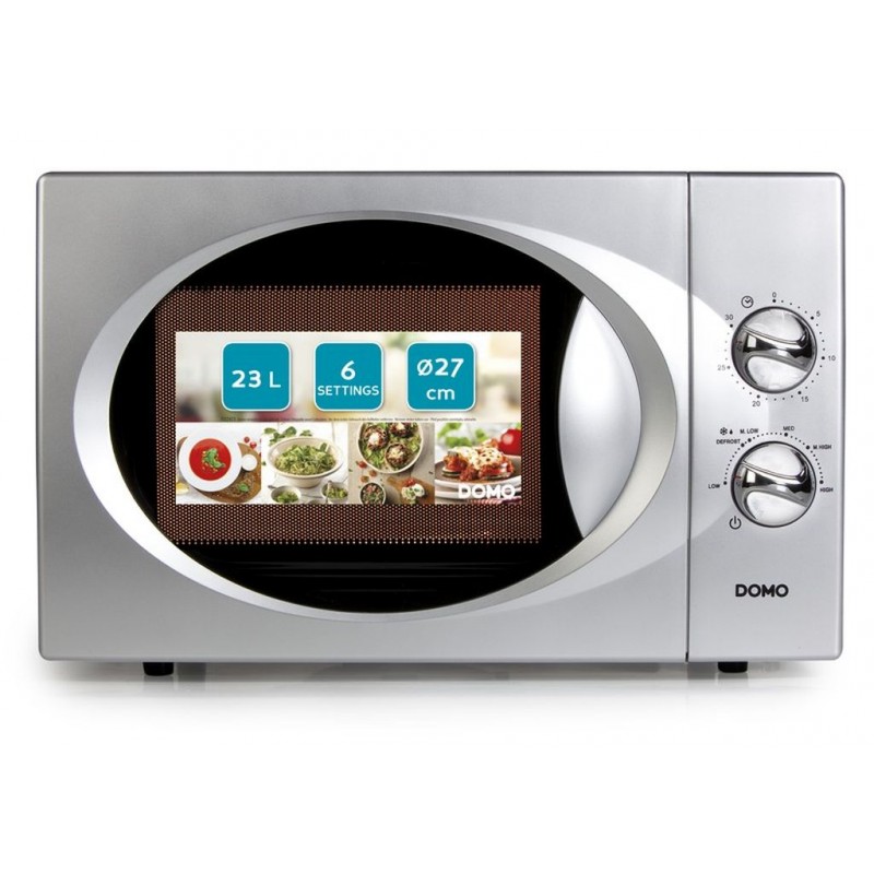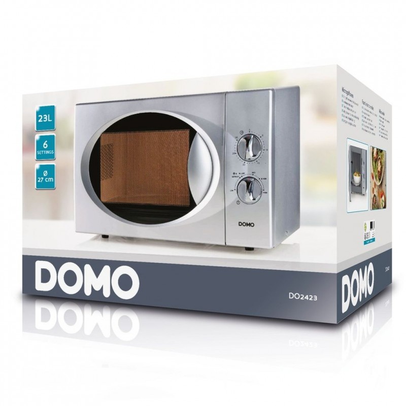 DOMO Mikrovlnná rúra DO2423Strieborná mikrovlnná rúra s jednoduchým mechanickým ovládaním pomocou dvoch otočných gombíkov. Zväčšenie vnútorný priestor s 27 cm otočným tanierom, 6 stupňami výkonu a časovačom.