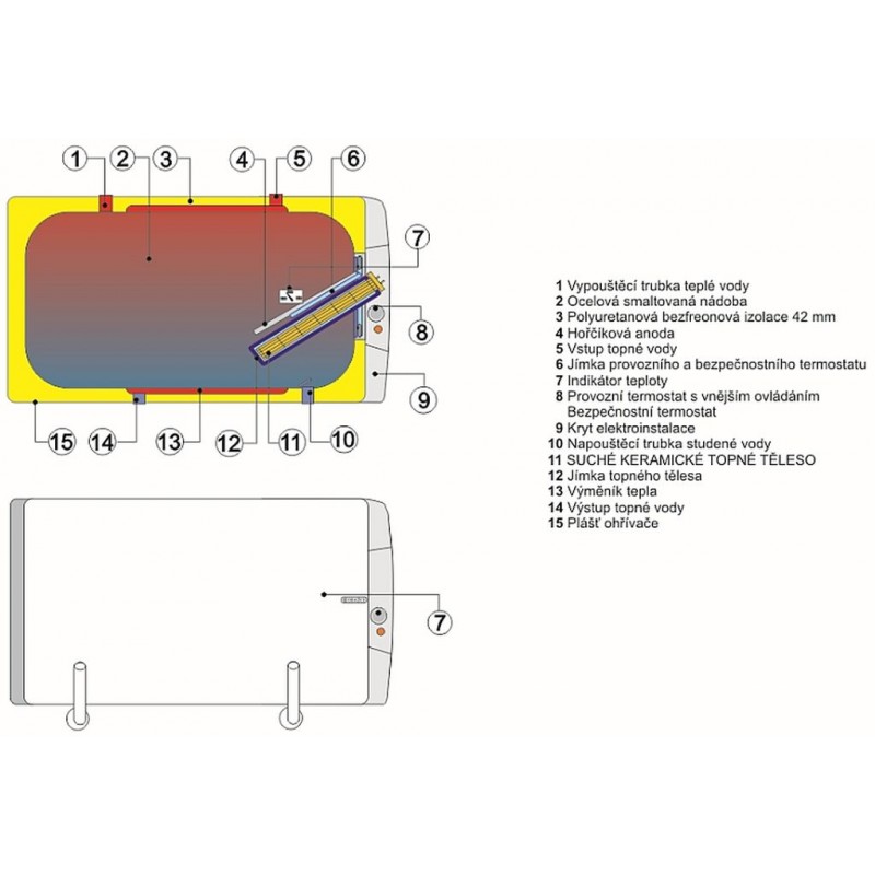 Výmenníkom. Ohrievač je možné napojiť na externý teplovodný zdroj s max. Teplotou 110 stupňov Celzia a tlaku 0,4 MPa. Ohrev zaisťuje výkonný dvojplášťový výmenník vrstvením teplej vody. Výmenník ohreje najprv vodu v hornej časti nádoby a potom ohrieva spodné vrstvy objemu.Tento spôsob postupného ohrevu je vhodný zvlášť k samotiažnym ústredným vykurovaním a malým samotiažnym solárne systémy pracuje v nútenom obehu aj v samoťažnom systému. Čidlo regulácie vykurovacej vody je možné vložiť do spoločnej objímky s čidlami elektroinštalácie.