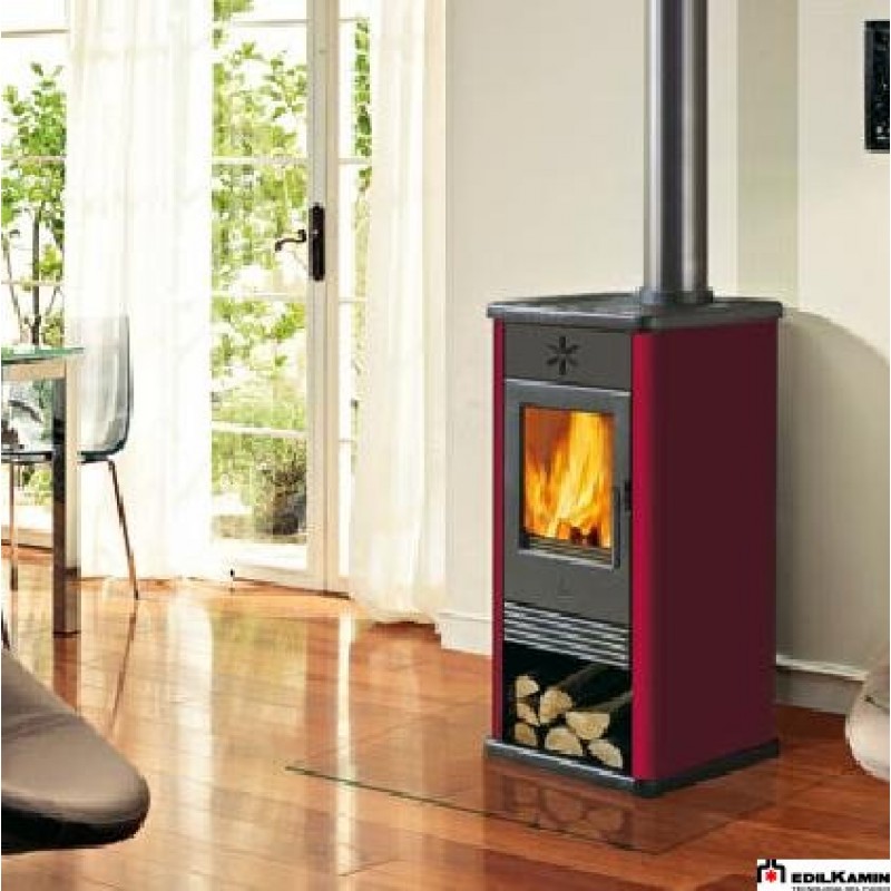 EDILKAMIN BLUES teplovzdušná krbové kachle na drevo bordó 641770Teplovzdušné krbové kachle na drevo BLUES - krbové kachle moderného designu, lakovaného kovu vo farebných prevedeniach bordó a šedá.Vnitřní konštrukcia z ocele, smaltovaná liatina s odnímateľnými čelnými a hornými krúžky pre varenie potravín. Vnútorná krytina z krbu Scamolex.Samozavírací dvere.