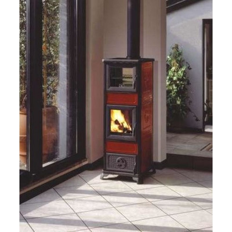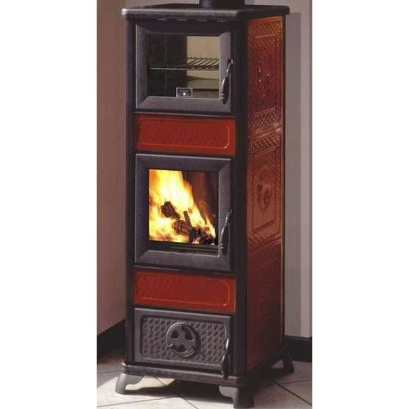 EDILKAMIN DAFNE teplovzdušná krbové kachle na drevo s pieckou bordó 434530Rustikálne keramické kachle DAFNEocelové konštrukcie s liatinovým ohniskom. Keramika ručne maľovaná. Predné a horný diel z lakovanej liatiny s praktickými odnímateľnými kruhovými platňami na ohrev pokrmov.