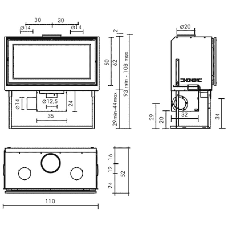 Výškovo nastaviteľný podstavec. Konštrukcia oceľ, ohnisko Ecokeram, veľké sklo s dvierkami otvárateľnými doprava aj doľava. Systém sekundárneho spaľovania a diaľkový ovládač (len pre verziu s ventilátorom).