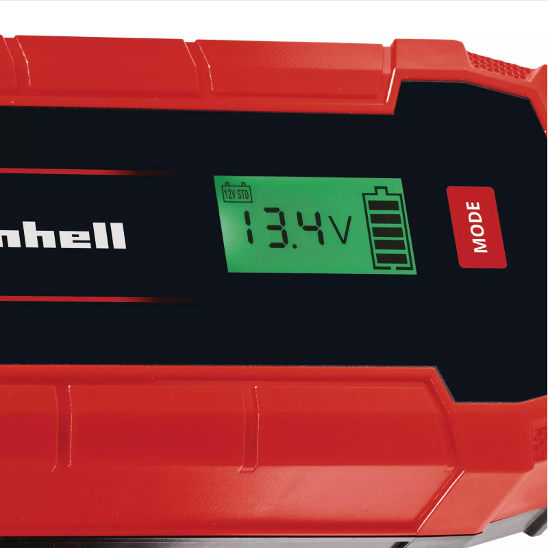 Automatická ochrana proti prebitiu, skratu a prepólovaniu chráni samotnú nabíjačku aj batériu. Nabíjačka Einhell spĺňa ochrannú triedu IP65, takže je prachotesná a odolná voči striekajúcej vode. LCD indikátor napätia a stavu nabitia poskytuje okamžitý prehľad o aktuálnom stave batérie. Nabíjačka ponúka štyri rôzne nastavenia nabíjania pre 12 V batérie. Displej zároveň upozorní na nesprávne pripojené svorky alebo prípadné problémy.