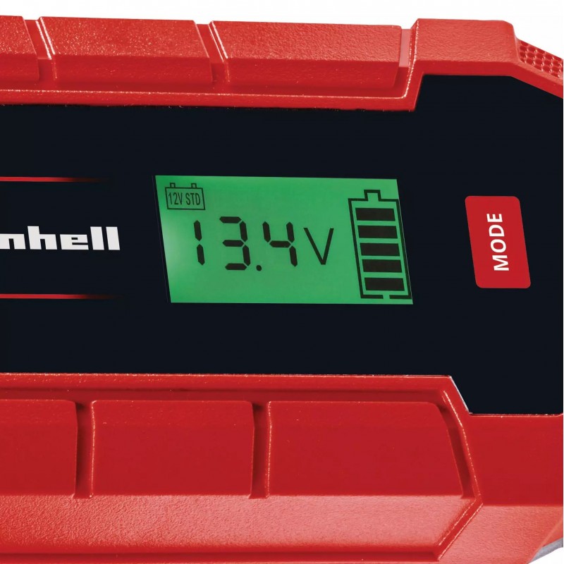 Nabíjačka batérií Einhell spĺňa normu ochrany IP65, takže je prachotesná a chránená proti striekajúcej vode. LCD indikátor napätia batérie a stavu nabitia okamžite zobrazuje aktuálny stav. Nabíjačka má štyri rôzne nastavenia nabíjania pre 12 V batérie. Displej vás tiež upozorní, ak sú svorky pripojené nesprávne, a okamžite informuje o prípadných problémoch. Svorky batérie sú plne izolované, takže nabíjačku možno bezpečne a jednoducho pripojiť. Telo nabíjačky je vybavené závesným okom na upevnenie na stenu.