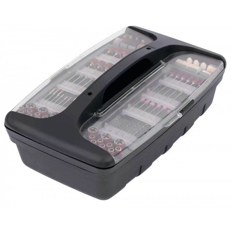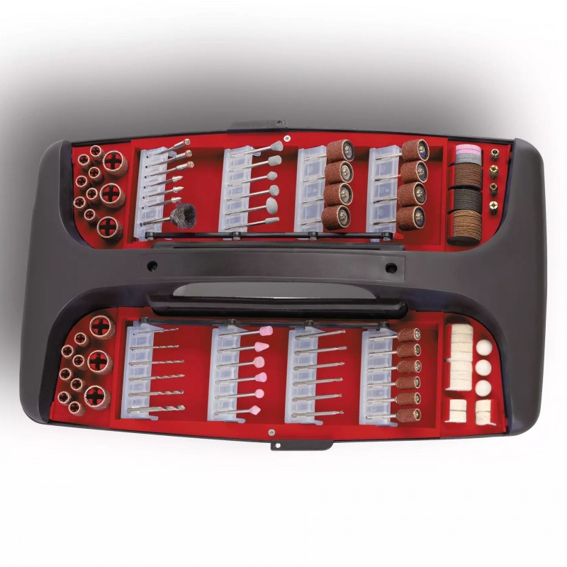 Nástroj na brúsenie a gravírovanie TC-MG 135 E je vysoko kvalitný a kompaktný prístroj, ktorý vďaka bohatej ponuke príslušenstva poskytuje široké možnosti použitia pri vŕtaní, frézovaní, brúsení a kartáčovaní. Vďaka aretácii vretena je možné rôzne nadstavce rýchlo a ľahko vymieňať. Elektronická regulácia otáčok zabezpečuje jemný rozbeh a umožňuje presné prispôsobenie výkonu konkrétnej úlohe. TC-MG 135 E má flexibilnú hriadeľ, ktorá umožňuje elegantné a jednoduché opracovanie rôznych častí obrobku. Pomocou teleskopického stojana a príslušného háčika je možné nástroj počas práce elegantne uchytiť. Vďaka mäkkému úchopu a ergonomickému dizajnu sa prístroj veľmi dobre drží. Súčasťou dodávky je aj rozsiahla, 189-dielna sada príslušenstva na brúsenie, vŕtanie, frézovanie a mnohé ďalšie činnosti, všetko uložené v praktickom úložnom boxe.