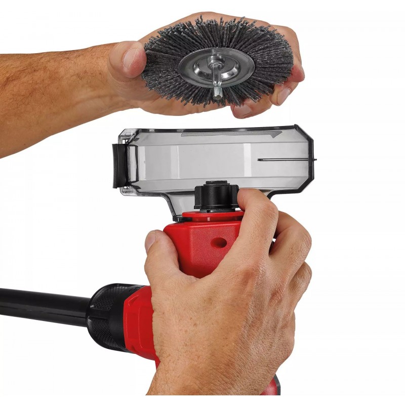 Teleskopická vodiaca rukoväť a nastaviteľná doplnková rukoväť s mäkkým úchopom a integrovaným úložným priestorom na kefy umožňujú ergonomickú manipuláciu. Aku čistič škár je dodávaný s 10 mm širokou nylonovou kefou pre povrchy citlivé na poškriabanie a 15 mm širokou oceľovou kefou pre efektívne odstraňovanie buriny na hrubých povrchoch. Obe kefy majú O 110 mm a možno ich vymeniť bez použitia náradia.