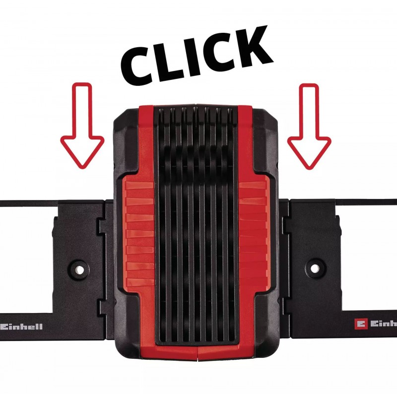 Žiadna dielňa by nemala byť bez originálneho nástenného držiaka Einhell Power X-Change. Umožňuje odkladať batérie úsporne a je vhodný na montáž hore nohami, napríklad pod pracovný stôl. Batérie budete mať vždy po ruke. Nástenné držiaky sú užitočné aj na cestách, pretože ich možno montovať do karavanov alebo dodávok. Systém zacvaknutia zabezpečuje, že batérie počas jazdy nevypadnú z držiakov.