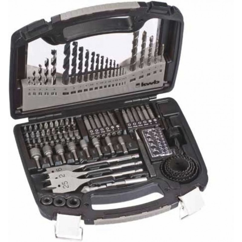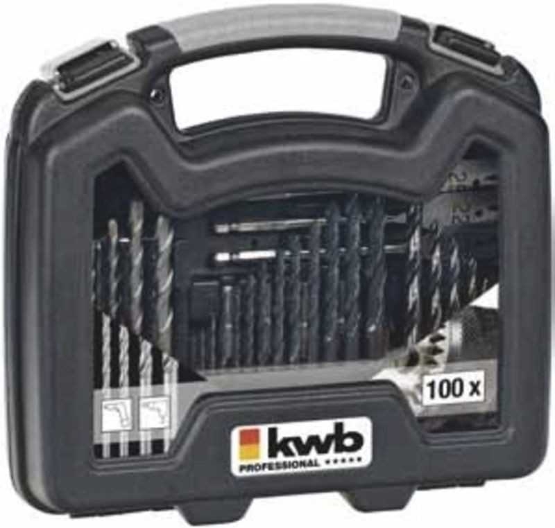 Einhell Set vrtákov a bitov KWB, 100-dielny set 109001V plastovom puzdre s bezpečným hliníkovým zámkom a integrovanou rukoväťou. Ideálny doplnok pre všetky akumulátorové skrutkovače, vŕtačky. Vŕtacie bity sú vhodné pre široký sortiment dreva, kameňa a kovu, šesťhranné bity, dierovacie pílky, dlhé a krátke bity vo všetkých bežných veľkostiach pre rýchle použitie v zariadení. Vrátane 3 plochých vrtákov pre dierovanie dreva a sadrokartónu pri nízkych otáčkach. Všetky bity a bitové skľučovadla sú vyrobené z vysoko kvalitnej chróm-vanádium ocele.