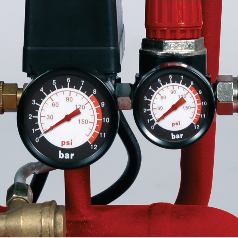 Výkonný kompresor poskytuje provozní tlak až 8 barů, ten lze regulovat pomocí redukčního ventilu. Regulovaný pracovní tlak i neregulovaný tlak v nádrži lze kdykoli odečíst pomocí dvou přehledných manometrů.