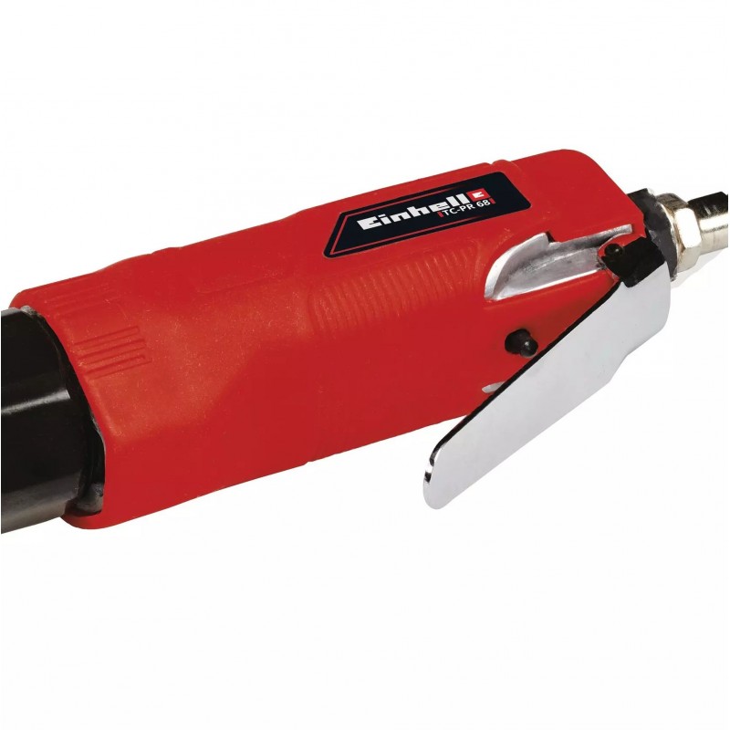 Pneumatický račňový skrutkovač Einhell TC-PR 68 je šikovným a výkonným pomocníkom pri upevňovaní alebo uvoľňovaní závitových spojení. Račňový skrutkovač má maximálny krútiaci moment 68 Nm. Protišmyková rukoväť umožňuje bezpečnú a pohodlnú prácu. Špičkový výkon ponúka pneumatický pohon pomocou hadice s vnútorným priemerom 9 milimetrov alebo viac. Na hlavici račňe možno nastaviť otáčanie v smere aj proti smeru hodinových ručičiek. Okrem 7 nástrčných kľúčov s rozmermi 9/10/11/13/14/17/19 mm, predĺženia a univerzálneho kĺbu je račňový skrutkovač dodávaný aj s olejničkou. Dodáva sa v praktickom prepravnom a skladovacom puzdre.