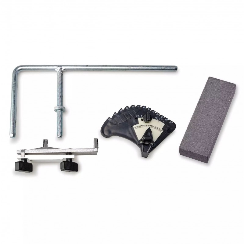 Súčasťou balenia je brusný kameň pre úpravu zrnitosti kotúča, kožený honovací kotúč a uhlová šablóna.