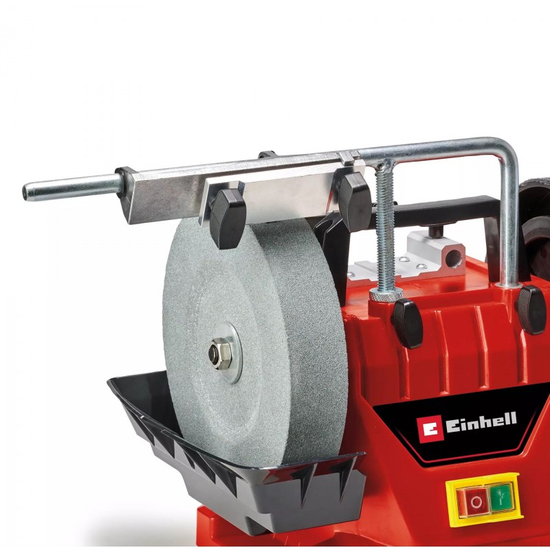 Brúska na mokré brúsenie TC-WG 200 Einhell je ideálna na ostrenie nástrojov bez poškodenia obrobku. Pri brúsení sa k kotúču pomaly uvoľňuje voda, čím sa zabraňuje prehrievaniu. Univerzálne zariadenie sa prispôsobí brúseniu širokej škály nástrojov z rôznych materiálov. Nerezová nádržka na vodu ochladzuje obrobok. Na leštenie je možné použiť leštiacu pastu. Uhol je ľahko nastaviteľný pomocou uhlomera, ktorý je súčasťou balenia. Brusný kotúč je možné pripraviť pomocou brusného kameňa. 4 gumové nožičky absorbujú vibrácie a zaisťujú bezpečnosť a stabilitu pri prevádzke. Súčasťou dodávky je jemnozrnný brusný kotúč na mokré brúsenie a kožený honovací kotúč na odstraňovanie brúsnych otřepov.