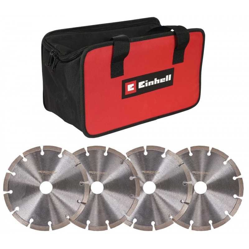 Aby bolo možné začať pracovať okamžite, je drážkovacia fréza Einhell TE-MA 1700 dodávaná s príslušenstvom. Súčasťou sú štyri vysokokvalitné diamantové rezné kotúče s priemerom 150 mm, ako aj kľúč na jednoduchú výmenu frézy. Súčasťou balenia je aj taška na uloženie frézy s príslušenstvom, ktorá umožňuje jej jednoduché prenášanie.
