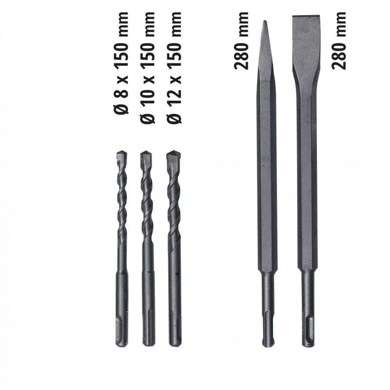 - Vrátane 3 ks vrtákov (O 8, 10, 12 mm) a špičatého aj plochého sekáča