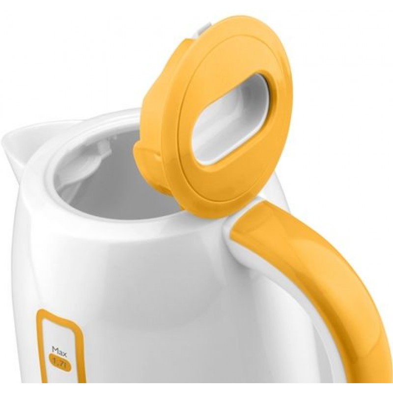 Kanvica ETA Dora 3599 v oranžovo-bielom prevedení s objemom 1,7 litra, skrytým vykurovacím telesom, stredovým konektorom, jednoduchým otváraním a jednoduchou údržbou.